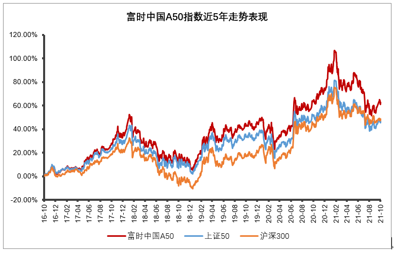 富时中国A50指数同时包含沪深两市股票,成长性极佳。近1年、3年、5年富时A50指数涨幅均高于上证50指数,涨多跌少。