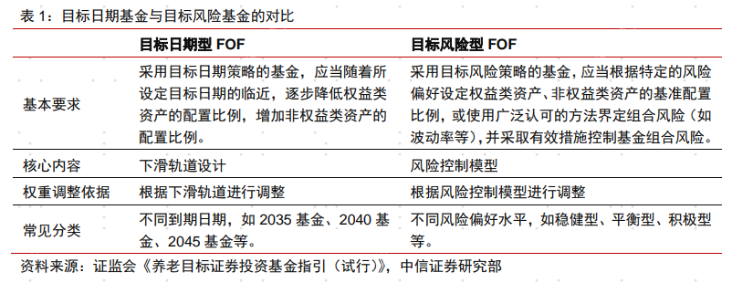 根据投资目标,公募 FOF 通常可划分为普通型与养老目标型;根据运作策略不同,养老目标型 FOF 又可以分为目标日期型与目标风险型。