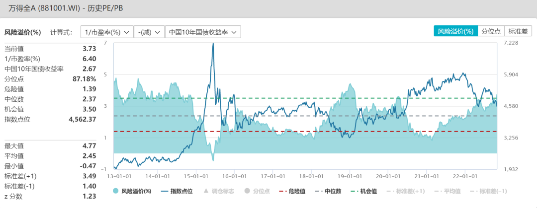 上图所示,万得全A指数目前风险溢价为6.40%,位于近10年87.18%的历史分位数较高区间,又可从侧面映射出市场或许来到了相对的低位,代表市场出现了比较好的投资机会。