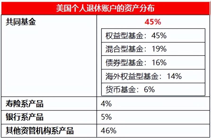 美国个人养老账户刚推出时,大部分人选择在银行开设账户,将部分储蓄搬家投资银行存款等低风险收益产品。随着美国资本市场的发展、投资者逐渐成熟、产品多元化且税收费率优惠,共同基金(可以理解为美国版的公募基金)逐渐成为大部分美国人民的首选。