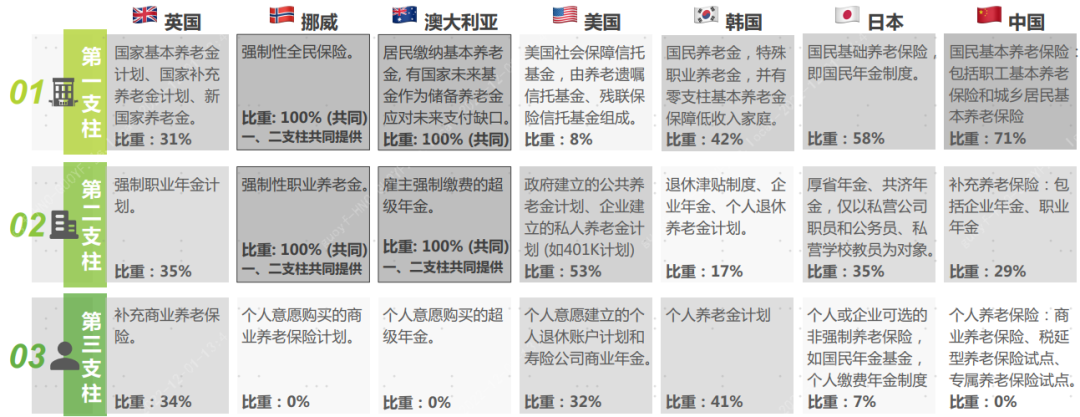 自世界银行在1994年首次提出涵盖公共养老金计划、职业养老保险计划和个人储蓄计划的养老金三大支柱概念起,世界上大部分国家及地区均采用“三支柱模式”作为养老基金的运营基本框架,通过政府、雇主、个人的共同力量承担养老压力。