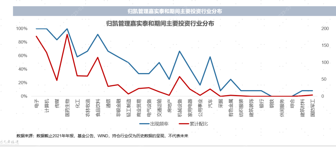 微观点睛,中观画龙,嘉实泰和的投资中强调密切跟踪中国经济发展背景下产业转移、格局变迁,体现在行业选择呈现“均衡侧重成长”的特点。从2016年3月归凯管理嘉实泰和基金以来披露的公开数据来看,其对电子、计算机、传媒、医药生物和化工行业具有明显偏好,均有涉猎,对食品饮料、农林牧渔、通信、非银、轻工、商业贸易和电器设备板块,也多次配置。