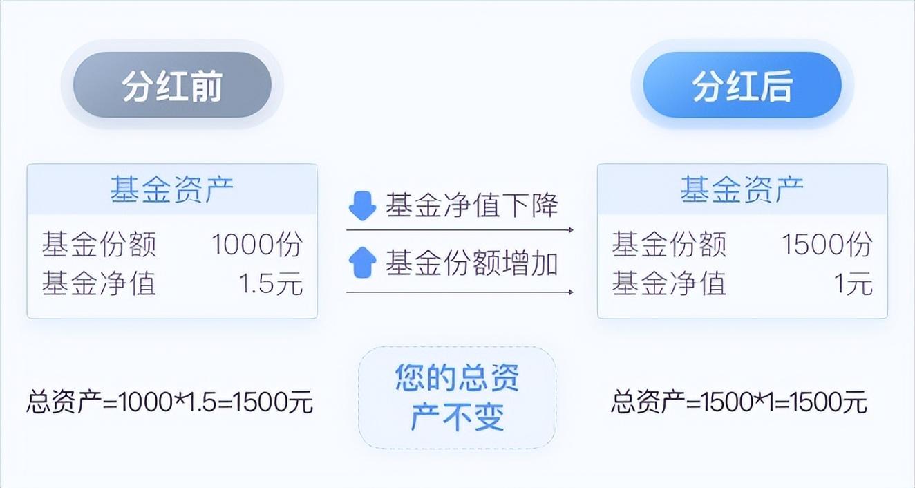 举个例子,您持有1000份基金,单位净值是1.5元,总资产是1500元。现该基金每单位份额分红0.5元。