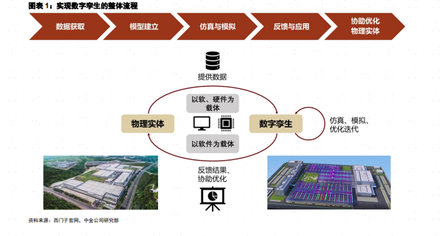 所谓数字孪生,是采用信息技术对物理实体的进行数字化定义和建模的过程,其核心理念在于通过对“数字孪生体”的仿真、控制、预测,对物理实体实现反哺优化,因此数字孪生有时也会被称为“工业元宇宙”。