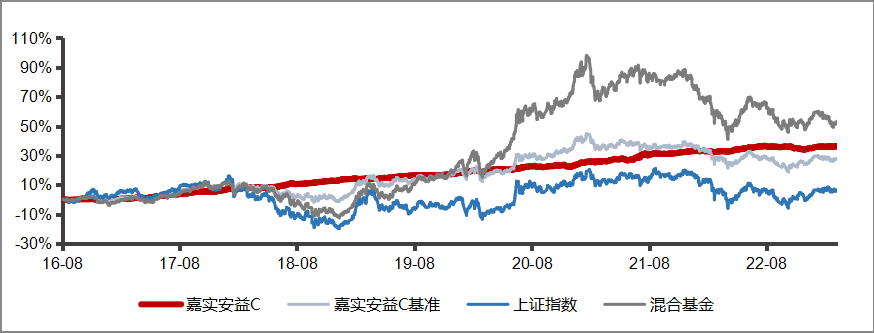 从下面这张嘉实安益C成立来对比上证指数、业绩基准的走势图,我们看得更为直观: