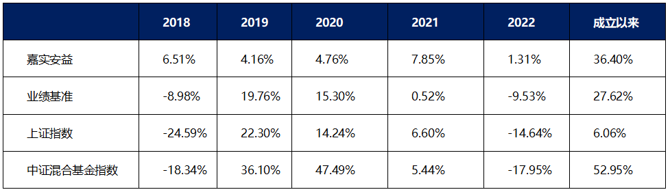 注:数据来源2023年一季报,截至2023Q1。嘉实安益2017-2022年净值增长分别为6.21%、6.51%、4.16%、4.76%、7.85%、1.31%,同期业绩比较基准分别为9.83%、-8.98%、19.76%、15.30%、0.52%、-9.53%,历任基金经理为:曲扬:2016/8/25-2020/12/30;王亚洲:2021/9/3-2022/9/8,赖礼辉:2020/10/19至今。
