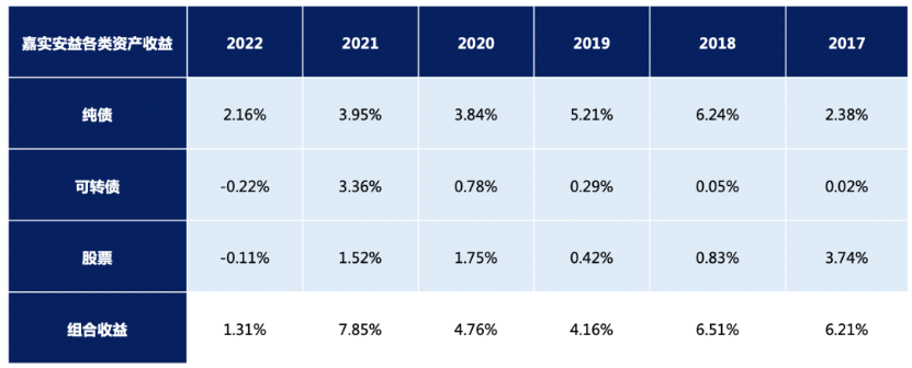 从各大类资产收益情况看,嘉实安益2017-2021连续五年各大类资产均获得正收益。