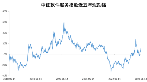 数据来源:iFinD,截至2023.6.14,2018-2022年中证软件服务指数涨跌幅分别为-28.75%、49.08%、4.93%、-1.22%、-25.53%