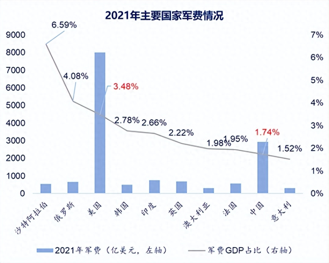 目前我国军费开支占GDP的比例为1.74%,较美、俄等国际重要国家仍有较大提升空间。