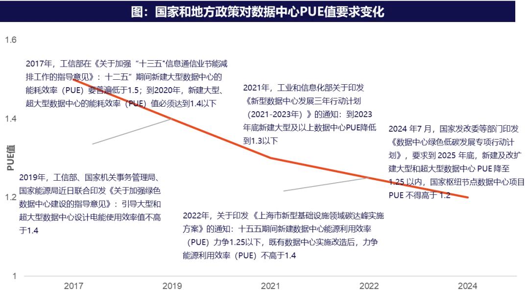 用电侧的节能提效是数据中心低碳转型的首要抓手,而降低电能利用效率(PUE)是短期内最直接的路径。PUE是数据中心总能耗与IT设备能耗的比值,数值越接近1,能效越高。政策层面已明确对 PUE 的硬性约束:北京、上海、广东等算力热点地区此前出台数据中心建设及升级改造要求,其中北京要求新建数据中心PUE准入值达到1.2,上海规定新建数据中心PUE不高于1.25。这一政策导向下,能效偏低的项目正逐步被淘汰,高能效数据中心在行业准入与运营成本上的优势愈发显著。