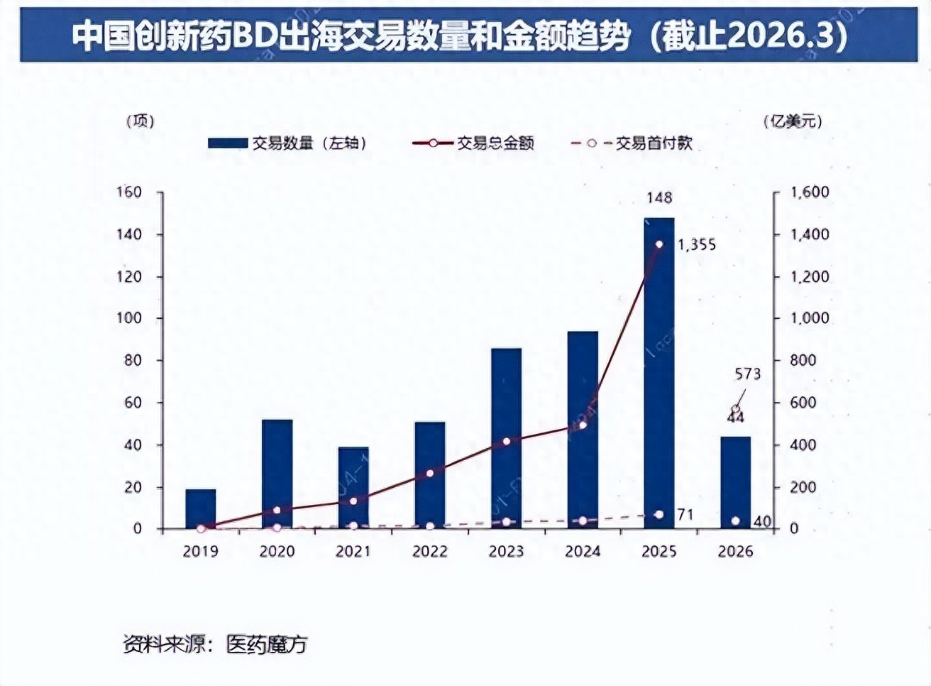 创新药领域近期的一大焦点是,根据央视报道,2026年前3个月,我国创新药对外授权交易总额超过600亿美元,接近2025年全年的一半,在全球授权交易中的渗透率占比接近80%,和去年的50%相比实现进一步跃升。